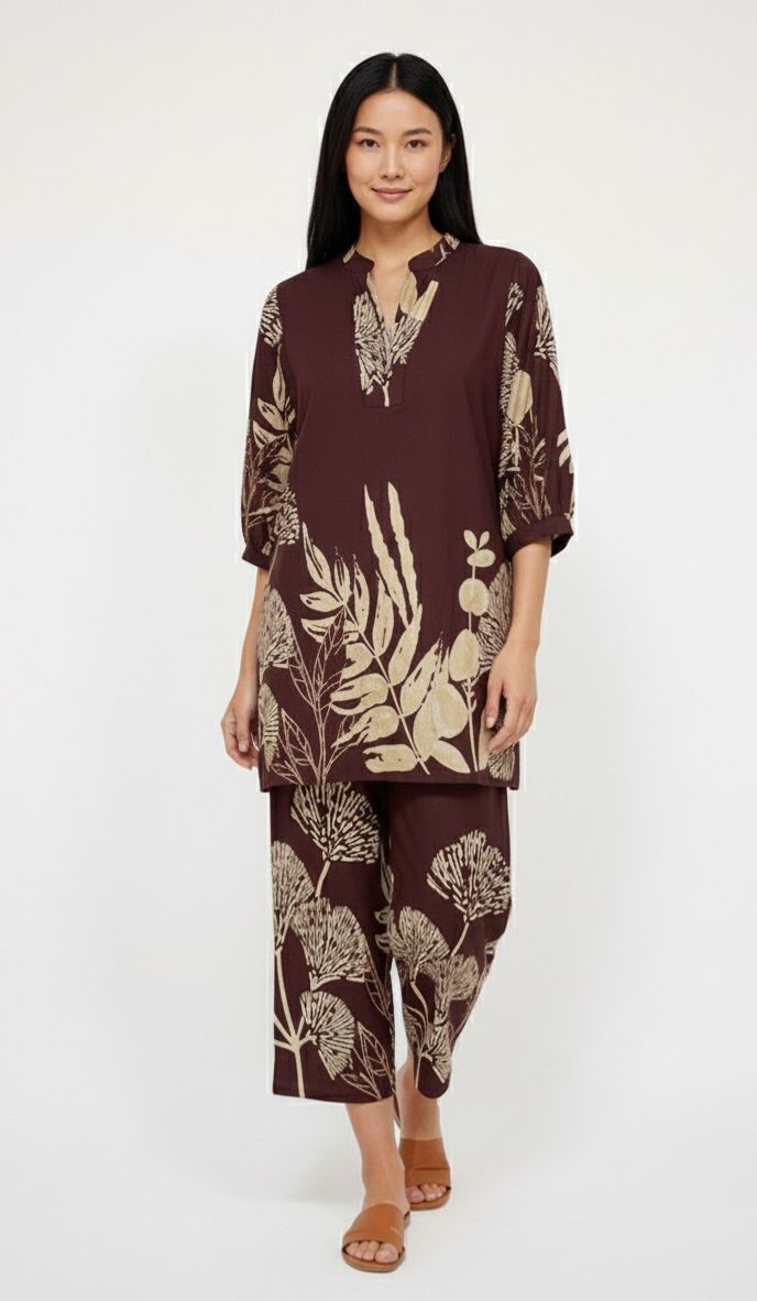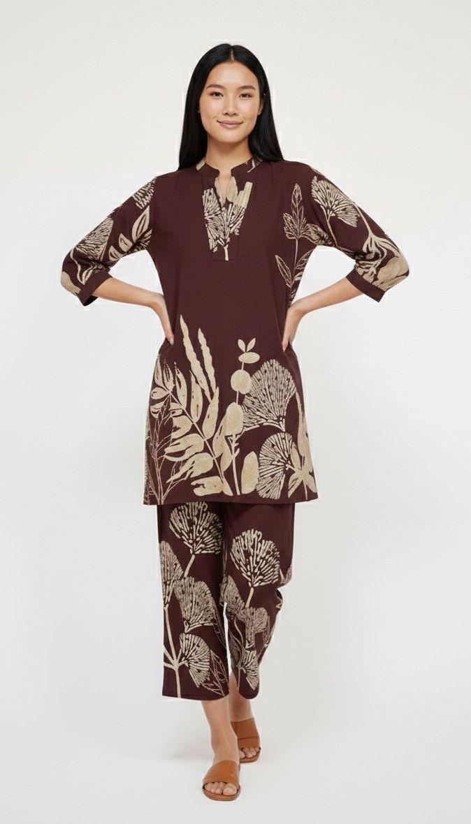 Embrace effortless elegance with this maroon co-ord set featuring a nature-inspired beige botanical print. The set includes a relaxed-fit kurta with a stylish V-notch neckline and ¾ sleeves, paired with matching straight pants for all-day comfort. Crafted from soft, breathable fabric, it’s the perfect fusion of comfort and chic—ideal for office wear, cozy evenings.