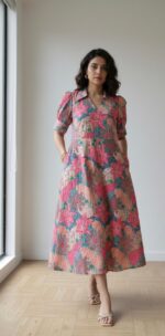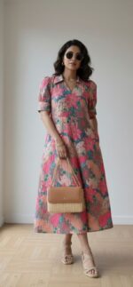 Step into effortless elegance with our Floral Puff-Sleeve Midi Dress, a perfect blend of comfort and charm. Crafted from premium breathable cotton, this dress features a vibrant floral print in shades of coral, teal, and blush — a celebration of bold femininity. The collared neckline and V-cut detail add a modern touch, while the short puff sleeves enhance its graceful silhouette.