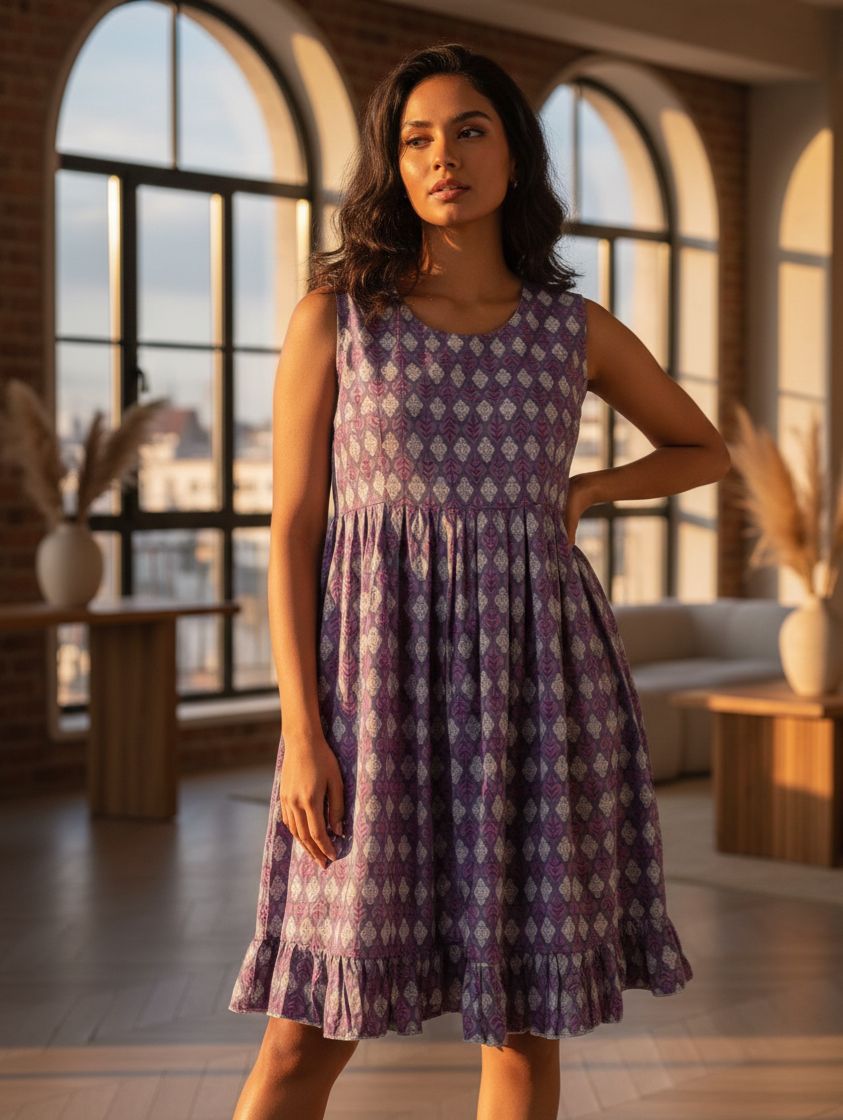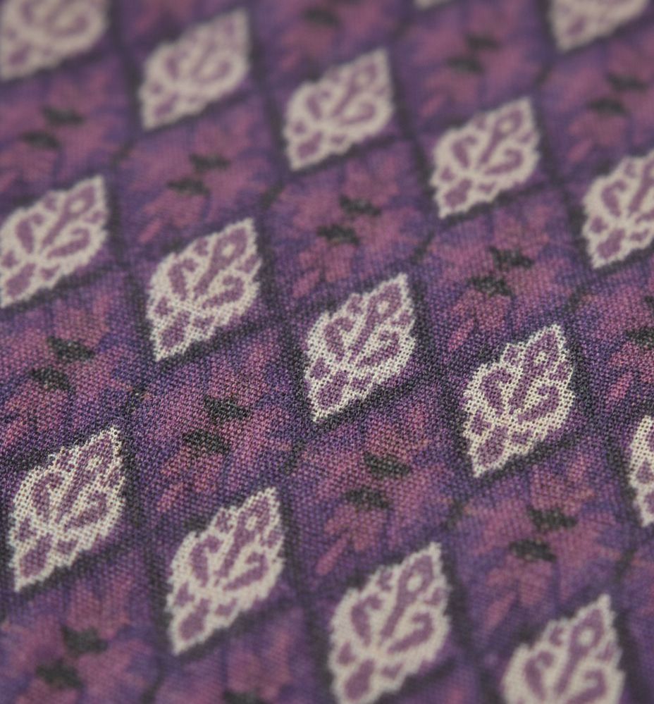 * Design: Intricate geometric Ikat-inspired print in a rich purple and white palette.
