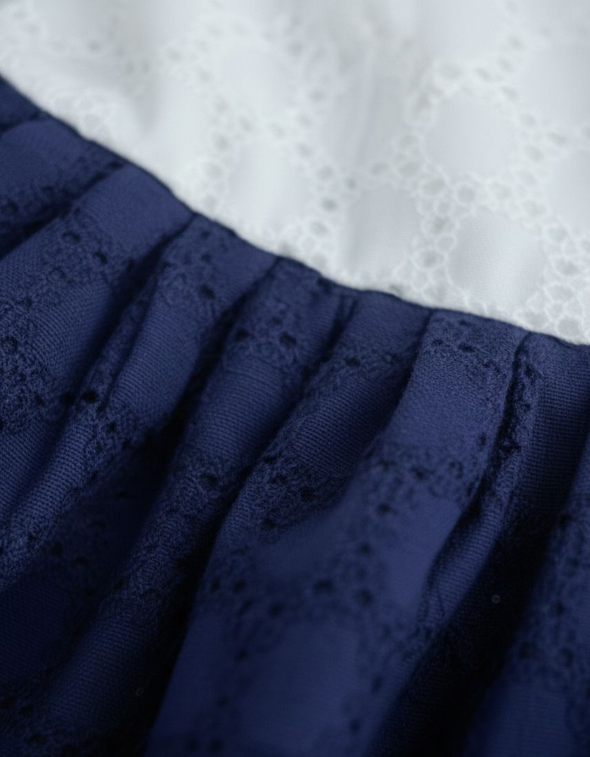 🤍💙 Elegant contrast design with cream bodice & deep navy pleated skirt
