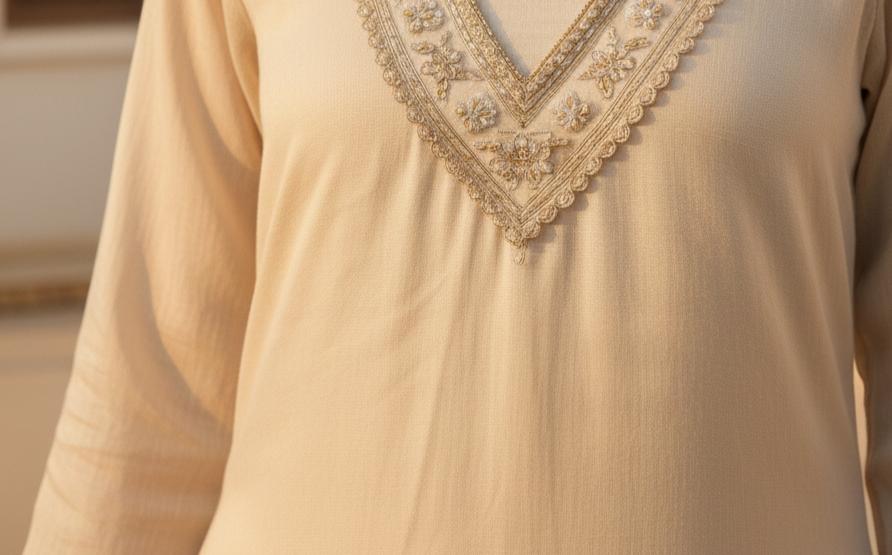 * Embellishments: Detailed mirror work is intricately hand-stitched along the neckline.