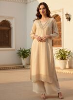 premium ensemble is crafted from tissue silk, a fabric known for its delicate, metallic sheen and crisp texture.